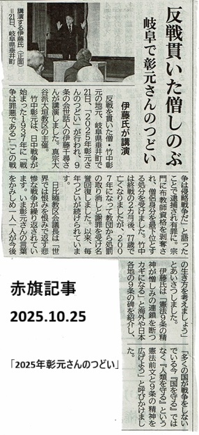 ●11月3日(月)10日・17日・24日(毎週月曜)日野基本射撃場正門付近 サイレントスタンディング 7:00~7:20 射撃訓練反対!公園にしよう! 主催:日野射撃場を撤去し、公園にするみんなの会 連絡先:058-242ー9701 岐阜県平和委員会 ●11月1日(土)・8日・15日・22日・29日(→毎週土曜日)16:00~16:30 関市大洞交差点 戦争法をつぶすためのスタンディングアピール in 関 主催:戦争法を許さず平和を求める関市民の会 問合せ:090-4861ー7070 石川 ●11月1日(土)13:30~ 大垣市ソフトピアジャパン1Fセミナーホール 2025ぎふコラボ西濃法律事務所友の会総会&記念講演 ・13:30~ 友の会総会 ・15:00~ 記念講演「東アジアの平和構築」 猿田佐世氏(弁護士、新外交イニシアティブ代表) 入場無料、会員でなくてもご参加いただけます 主催:ぎふコラボ西濃法律事務所友の会 連絡先:弁護士法人ぎふコラボ西濃法律事務所内 TEL:0584-81-5105 FAX:0584-74-8613●10月29日(水)13:30~ 各務原市役所前交差点付近 憲法を変えるな!平和を守れ!スタンディング 主催:九条の会・各務原 連絡先:058-384ー5726 ●10月27日(月)日野基本射撃場正門付近 サイレントスタンディング 7:00~7:20 日野射撃場を撤去し、公園にするみんなの会 (連絡先:058-242ー9701 岐阜県平和委員会) ●10月25日(土)17:00~17:30 関市大洞交差点 戦争法をつぶすスタンディングアピール in 関 主催:戦争法を許さず平和を求める関市民の会 (問合せ 090ー4861ー7070 石川) ●10月21日(月)13:30~15:30 (垂井町明泉寺)不破郡垂井町岩手631 TEL 0584-22-1445 2025年 竹中彰元さんのつどい ~反戦を貫いた僧 竹中彰元~ 講師:伊藤千尋氏(9条の会世話人、フリー国際ジャーナリスト) 演題:「9条の会に込められた思い~憎しみの連鎖を絶つ」 主催:真宗大谷派大垣教区 TEL 0584ー78-3363 赤旗記事25.10.25→こちら ●10月20日(月)日野基本射撃場正門付近 サイレントスタンディング 7:00~7:20 日野射撃場を撤去し、公園にするみんなの会 (連絡先:058-242ー9701 岐阜県平和委員会) ●10月19日(日)13:30~ 各務原市役所前交差点付近 憲法を変えるな!平和を守れ!スタンディング 主催:九条の会・各務原 連絡先:058-384ー5726 ●10月19日(日) 第33弾 岐阜総がかり行動 <会場>岐阜市 清水緑地公園 <集会>10:30~ <デモ>11:10~ 止めよう戦争への道 ~ 戦争させない!9条壊すな!~ 主催:戦争させない・9条壊すな!岐阜総がかり行動実行委員会 連絡先:フォーラム岐阜 〒500-8148 岐阜市曙町4-19-1 TEL 058-247-7650(浅野)