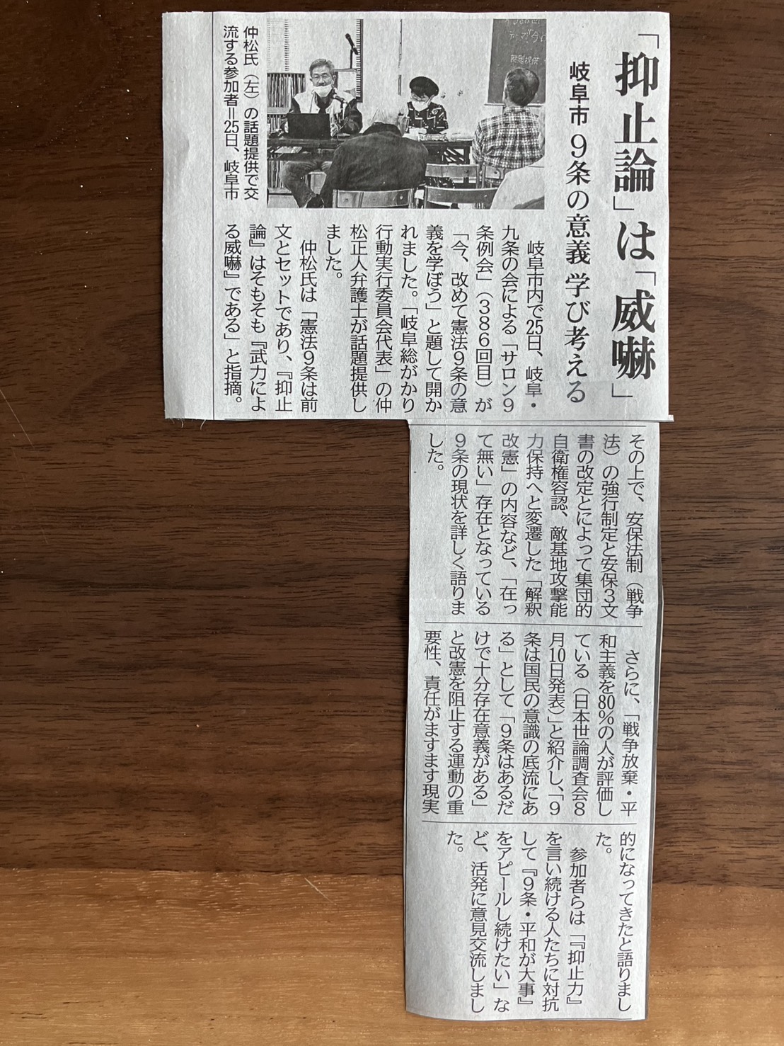★「サロン9条」第383回例会 6月24日(火) 午後2時~4時 日本キリスト教会岐阜教会2F
