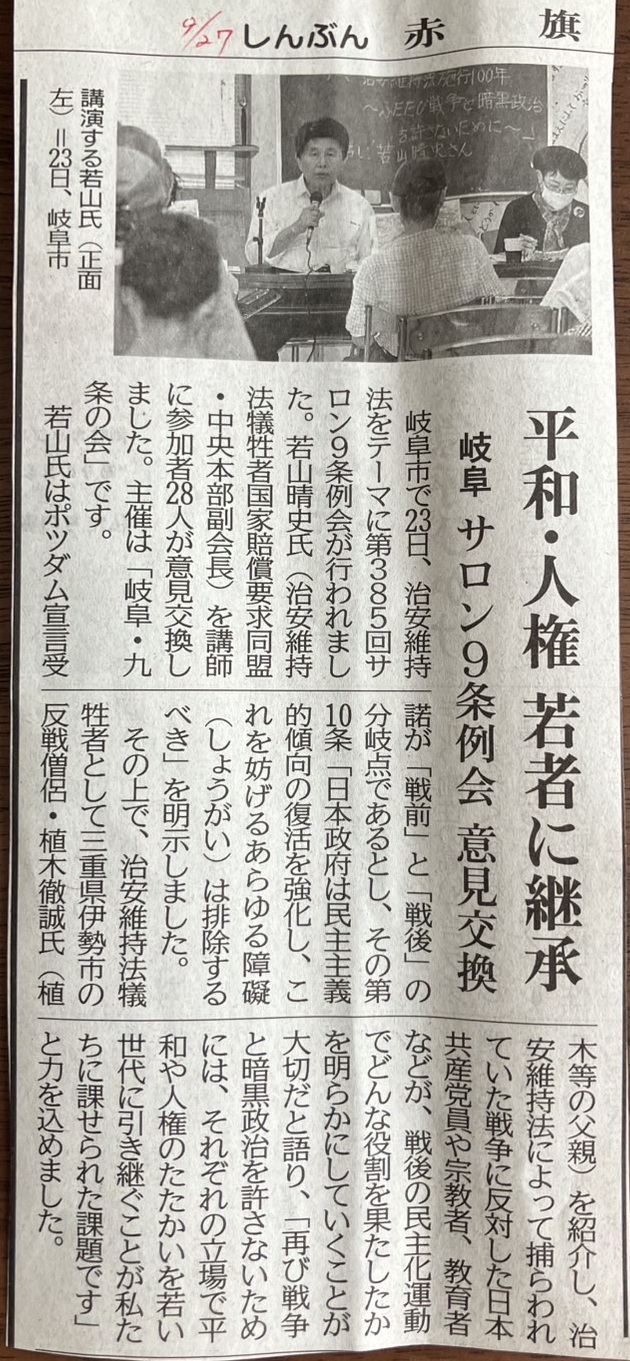 ★ 「サロン9条」第385回例会 9月23日(火・祝)午後3時~5時 日本キリスト教会岐阜教会2F